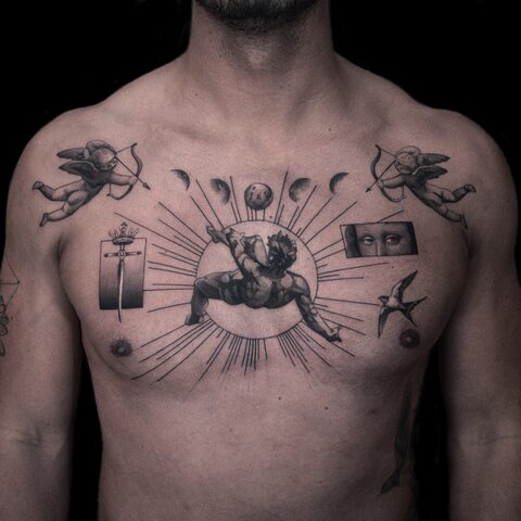 Hallo, ich bin Koukos aus Athen, Griechenland! Ich habe 2011 während meines Studiums an der Universität der Fine Arts in Athen mit dem Tätowieren begonnen und bin seit 2016 Vollzeit-Tätowierer. Ich liebe es um die Welt zu reisen und mehr über Tattoos, Menschen und Kulturen zu lernen. Mein Stil ist eine Mischung aus Realismus, feinen Linien, Dotwork und Skizzenstil mit einem grafischen/abstrakten Ansatz. Für mich ist jeder einzelne Kunde etwas Besonderes, deshalb mache ich jedes Mal ein einzigartiges, individuelles Design. Das, was ich an meinem Job am meisten liebe, ist das Feedback und das Vertrauen/die Liebe, die ich von meinen Kunden zurückbekomme. Das erfüllt mich mit Energie und positiver Stimmung!