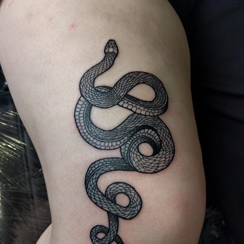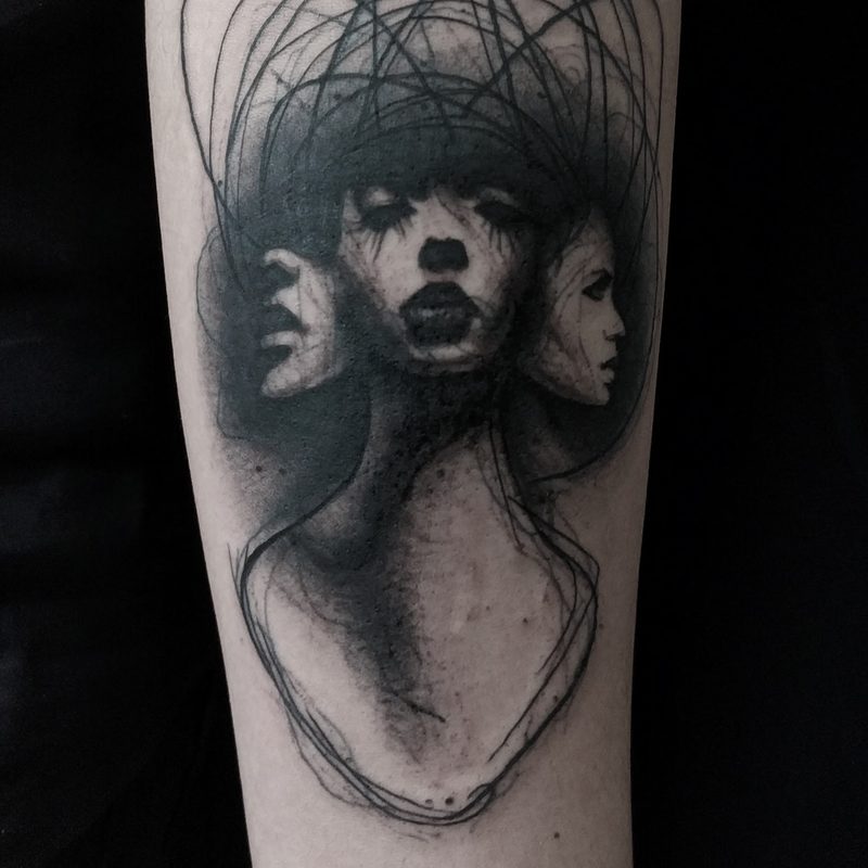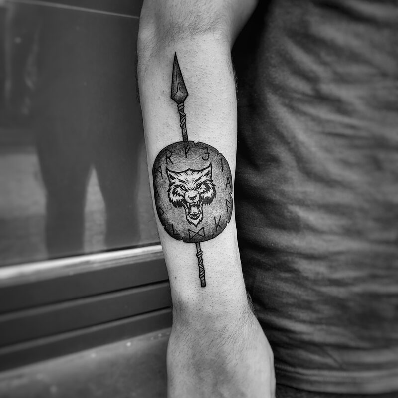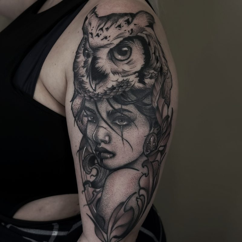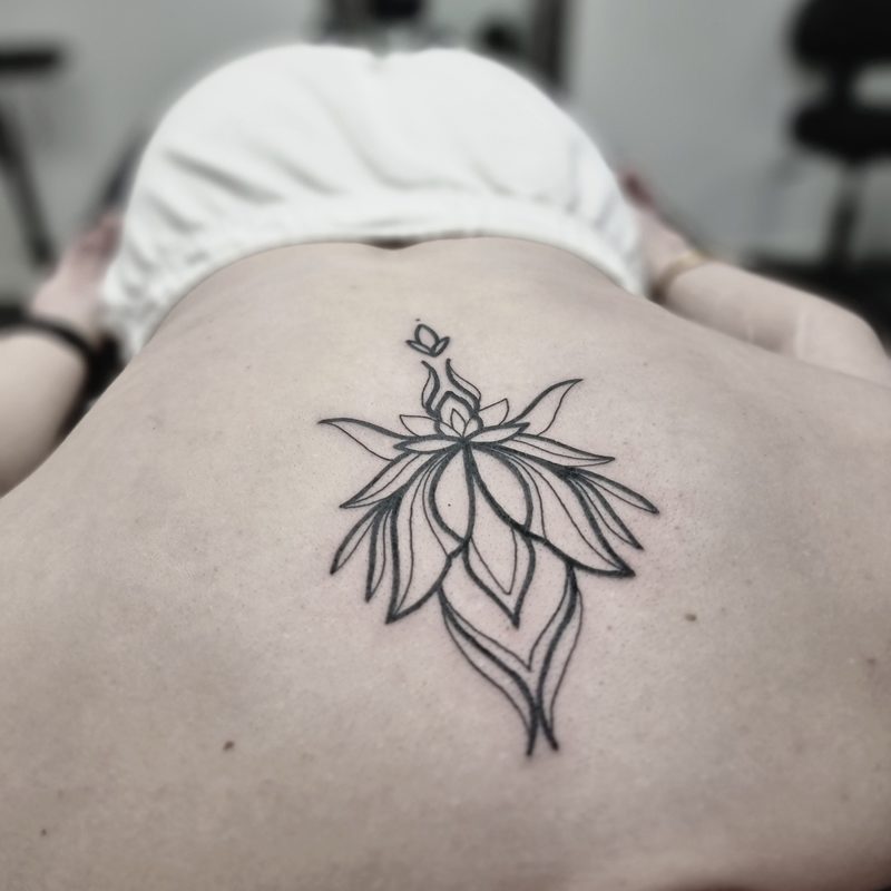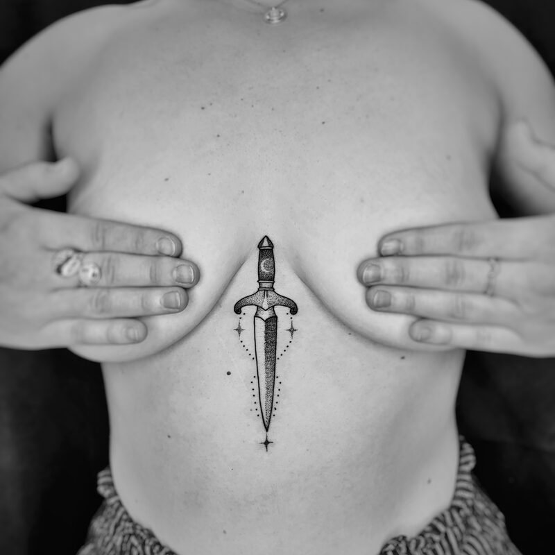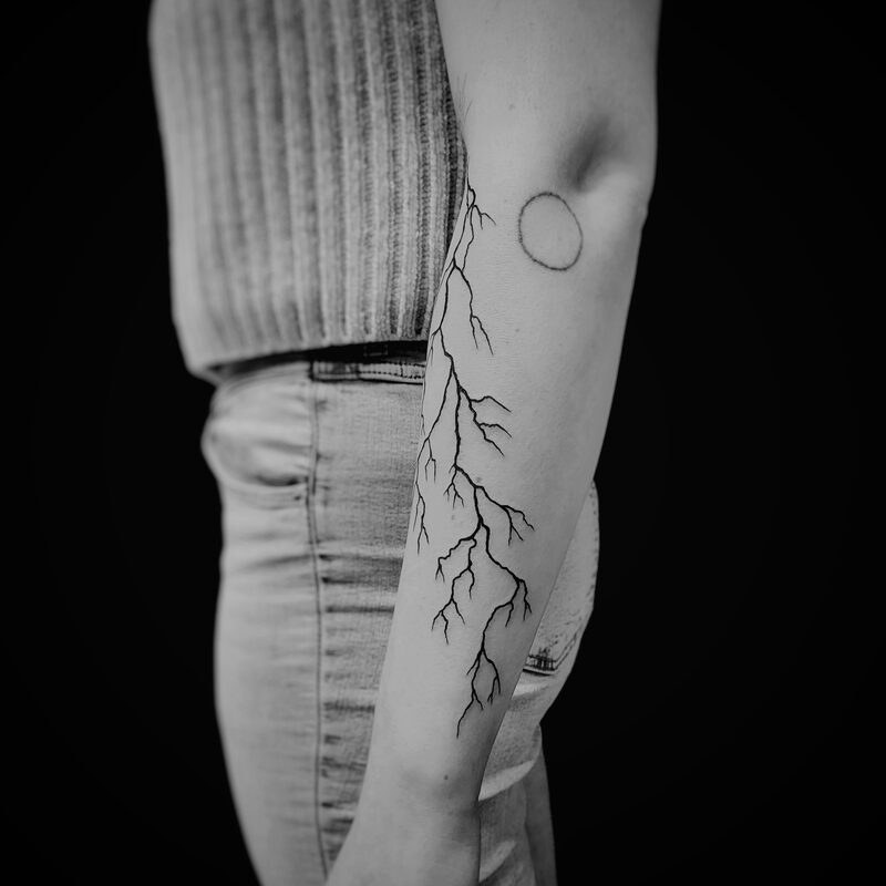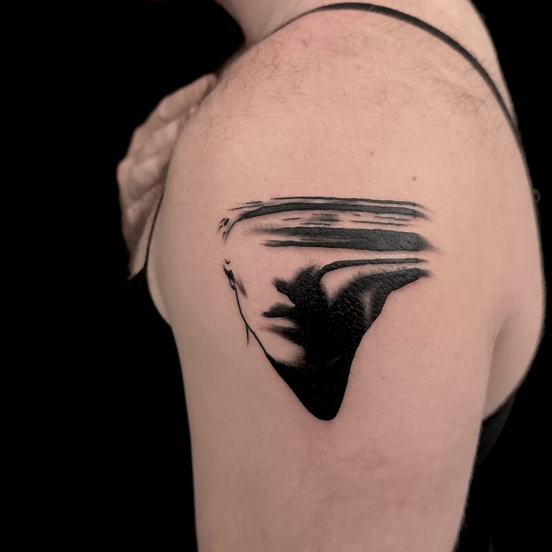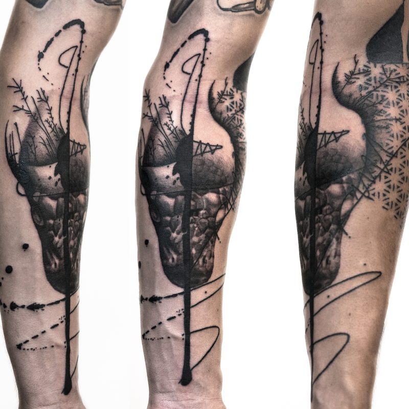 I am mainly interested in blackwork. My pieces consists of heavy block shading, incomplete and staggered outlines and stark contrasts where I emphasize the skin as the highlight. I love doing custom pieces, but also dedicate a lot of time to making new flash. I always try to make my flash as unique as possible, whether it's a rework of a traditional design or a concept of my own.