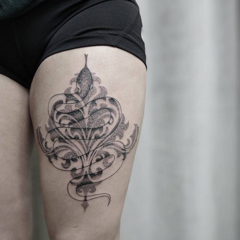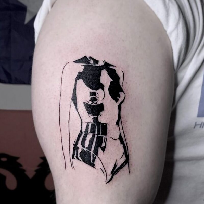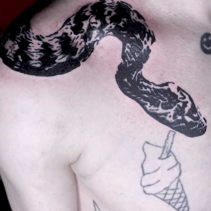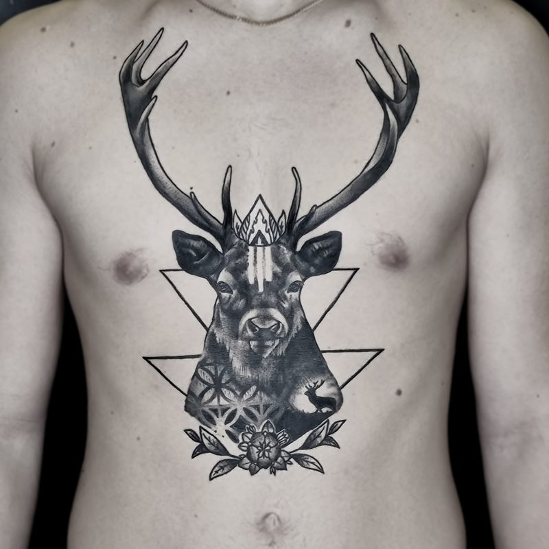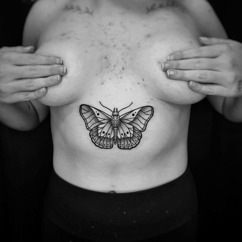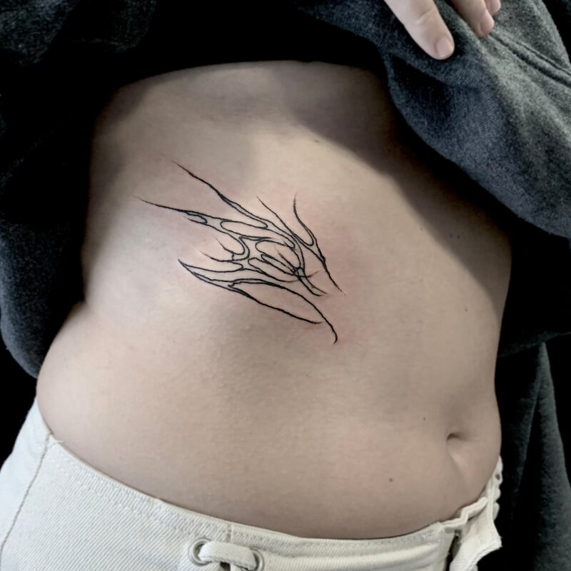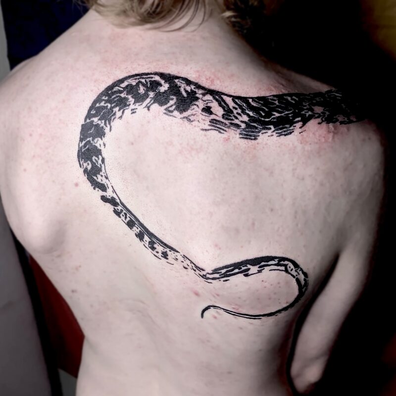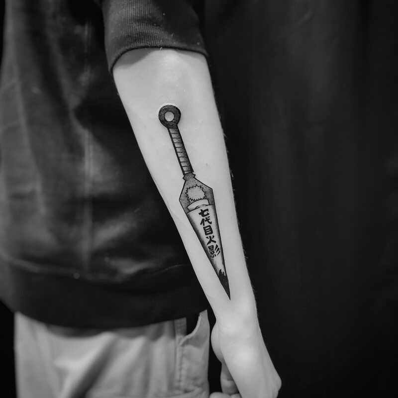 I am mainly interested in blackwork. My pieces consists of heavy block shading, incomplete and staggered outlines and stark contrasts where I emphasize the skin as the highlight. I love doing custom pieces, but also dedicate a lot of time to making new flash. I always try to make my flash as unique as possible, whether it's a rework of a traditional design or a concept of my own.