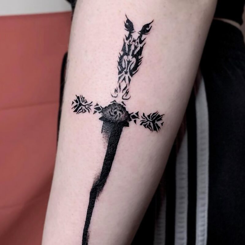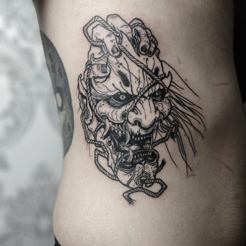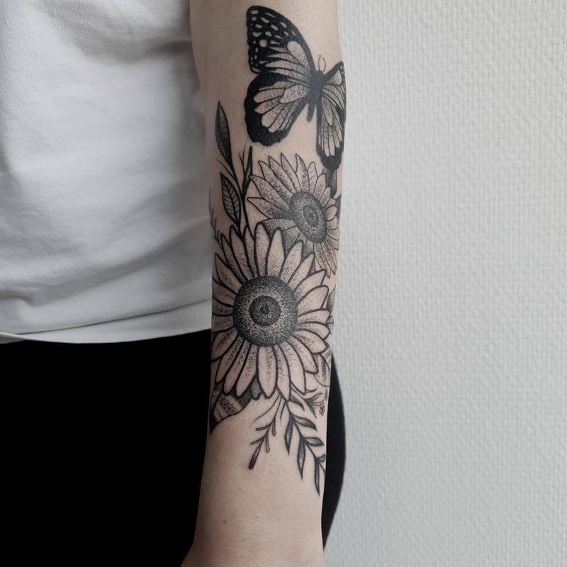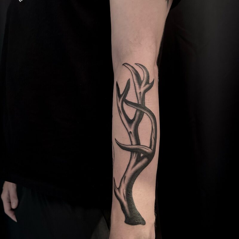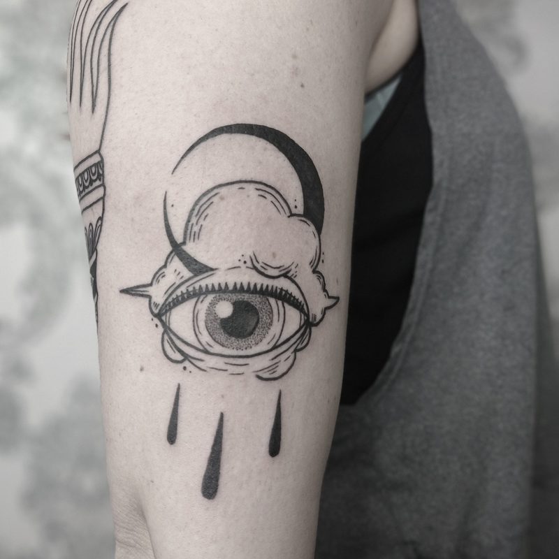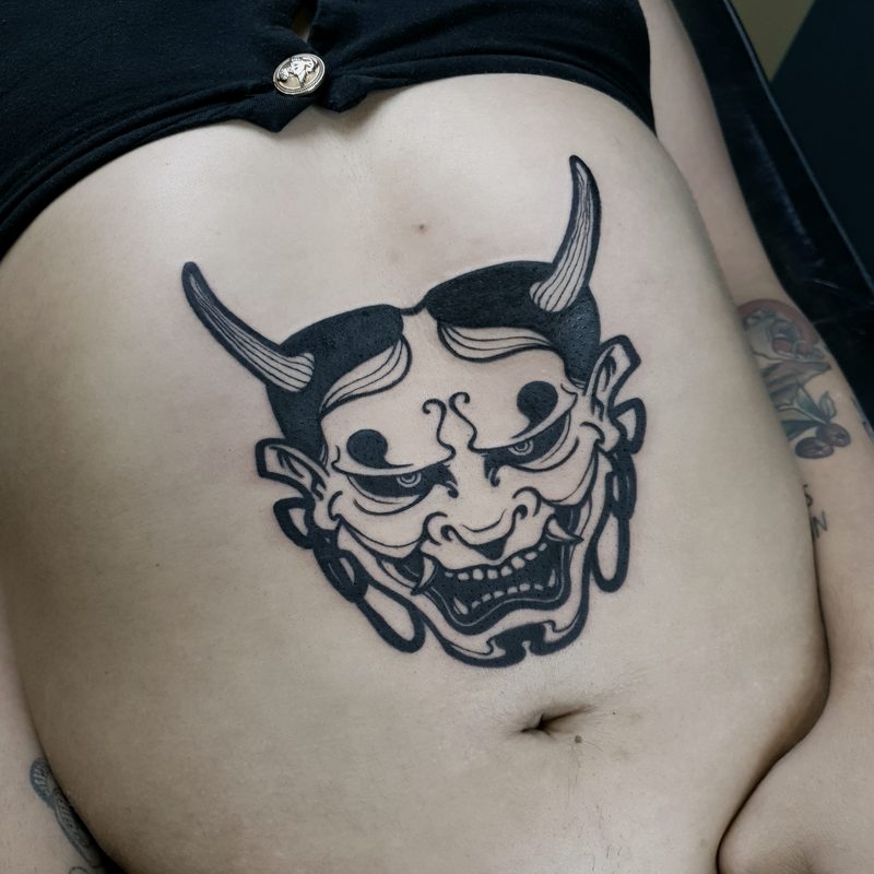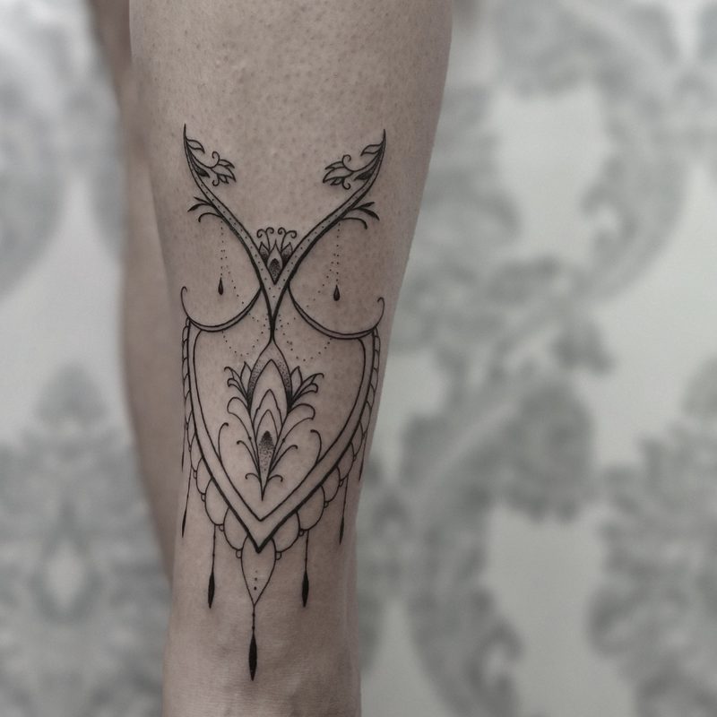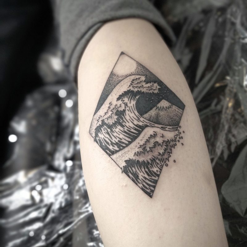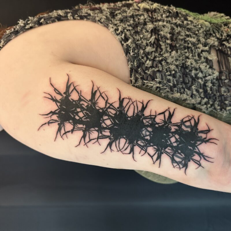 I am mainly interested in blackwork. My pieces consists of heavy block shading, incomplete and staggered outlines and stark contrasts where I emphasize the skin as the highlight. I love doing custom pieces, but also dedicate a lot of time to making new flash. I always try to make my flash as unique as possible, whether it's a rework of a traditional design or a concept of my own.