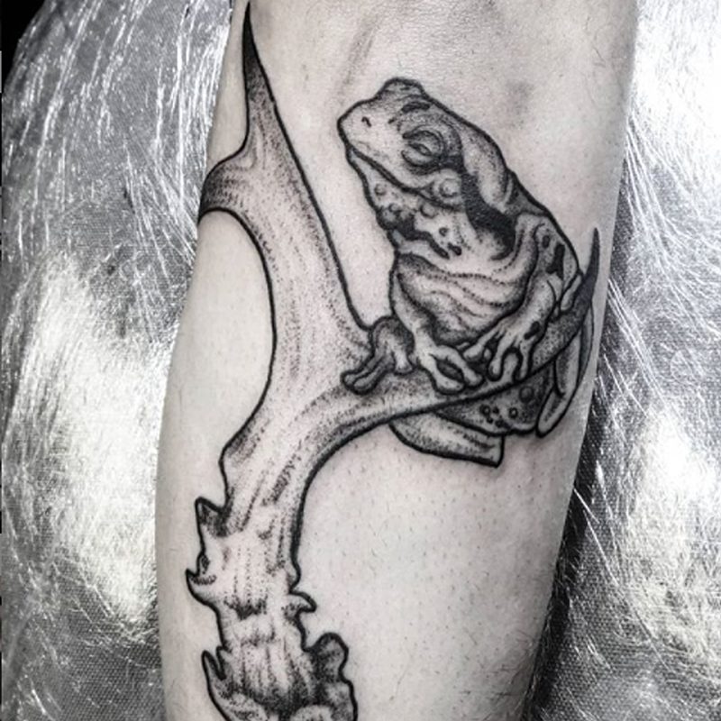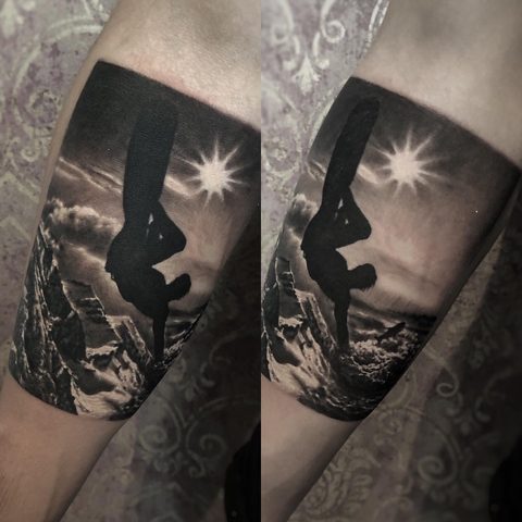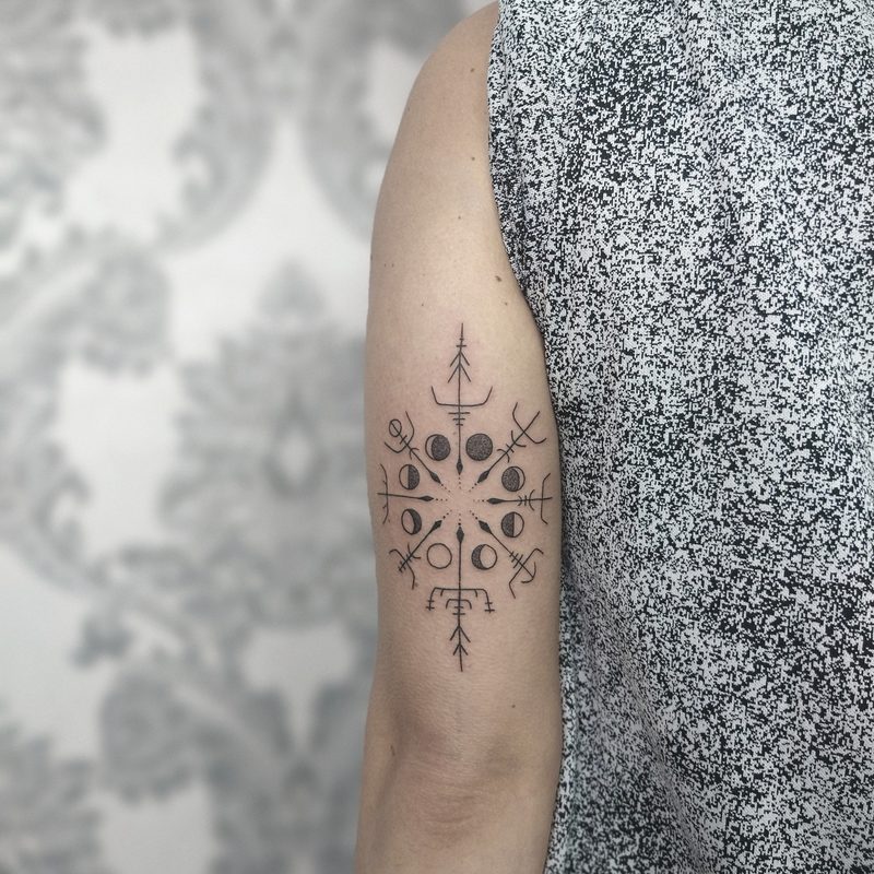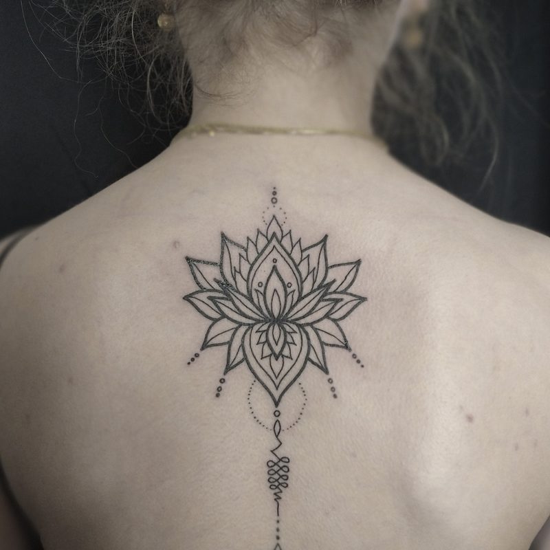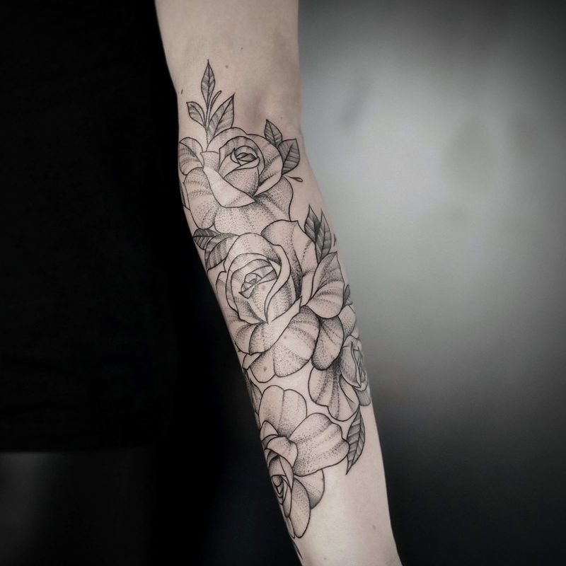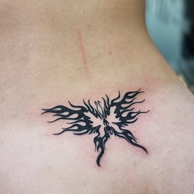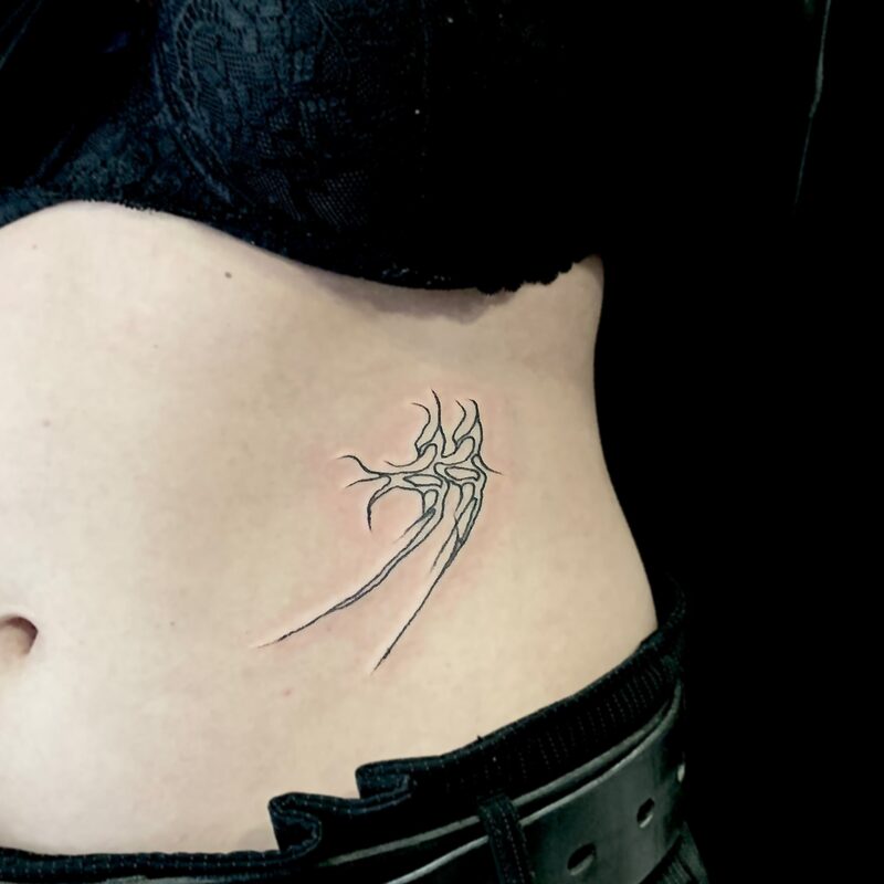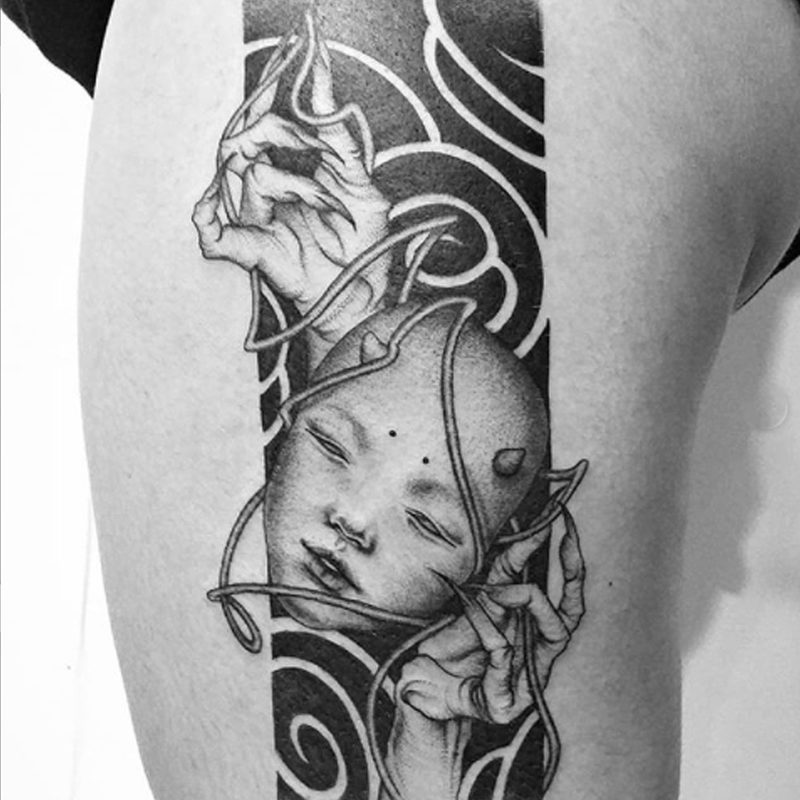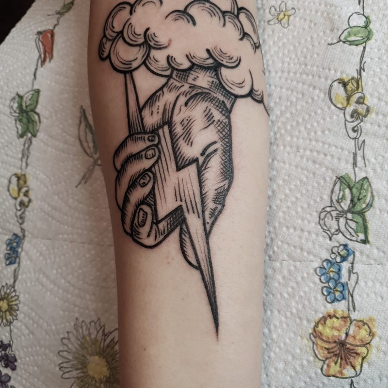 I am mainly interested in blackwork. My pieces consists of heavy block shading, incomplete and staggered outlines and stark contrasts where I emphasize the skin as the highlight. I love doing custom pieces, but also dedicate a lot of time to making new flash. I always try to make my flash as unique as possible, whether it's a rework of a traditional design or a concept of my own.